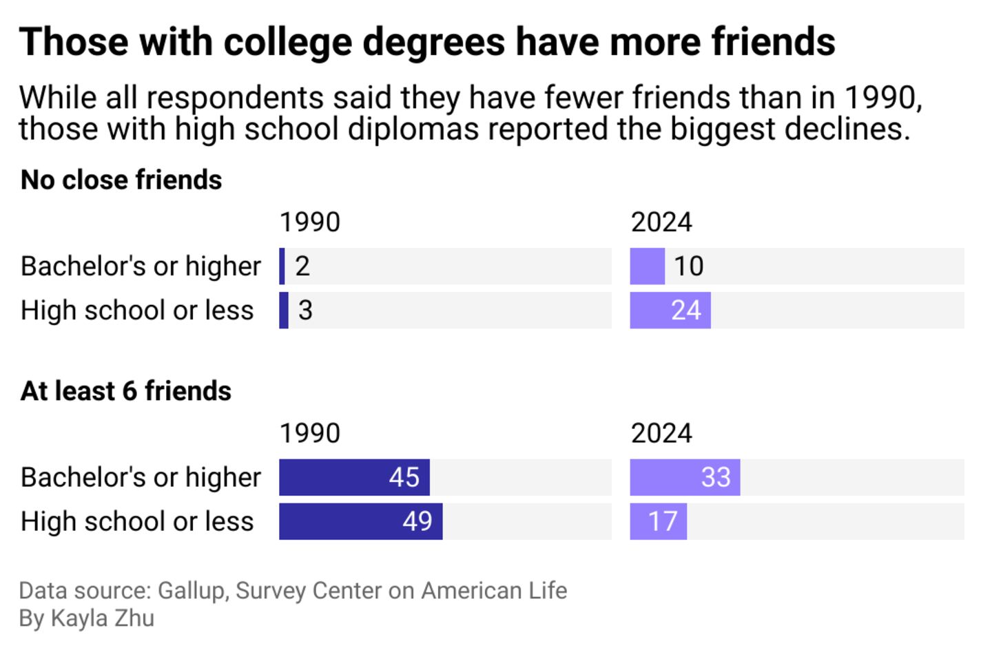 Still, in a nation grappling with social isolation and a loneliness public health crisis, a troubling pattern has emerged: Americans without a college degree are significantly more likely to report having no close friends than those with a college degree. According to the Survey Center on American Life's 2024 American Social Capital Survey, nearly 1 in 4 Americans with a high school education or less reported having no close friends, compared to just 1 in 10 college graduates. This gap represents a significant shift from 1990, when these figures stood at just 2% and 3%, respectively. Overall, 17% of Americans now report having no close friends at all, and 23% say they have no close friends living nearby.
