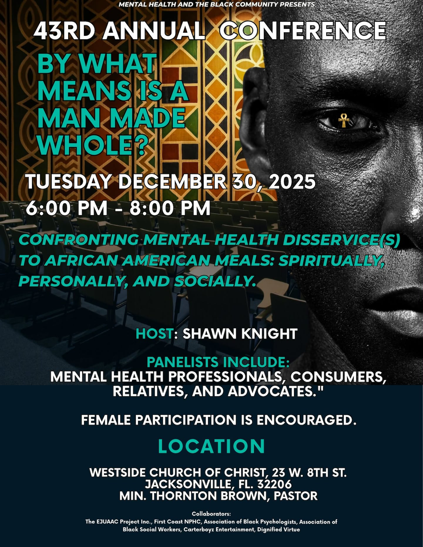 Now, as we prepare to say goodbye to 2025 and hello to 2026 I am asking all men to join me and the Mental Health and The Black Community as they present the 43rd Annual Conference “By What Means Is a Man Made Whole?” on Tuesday December 30th at Westside Church of Christ 23 W. 8th Street here in Jacksonville from 6:00 pm to 8 pm.