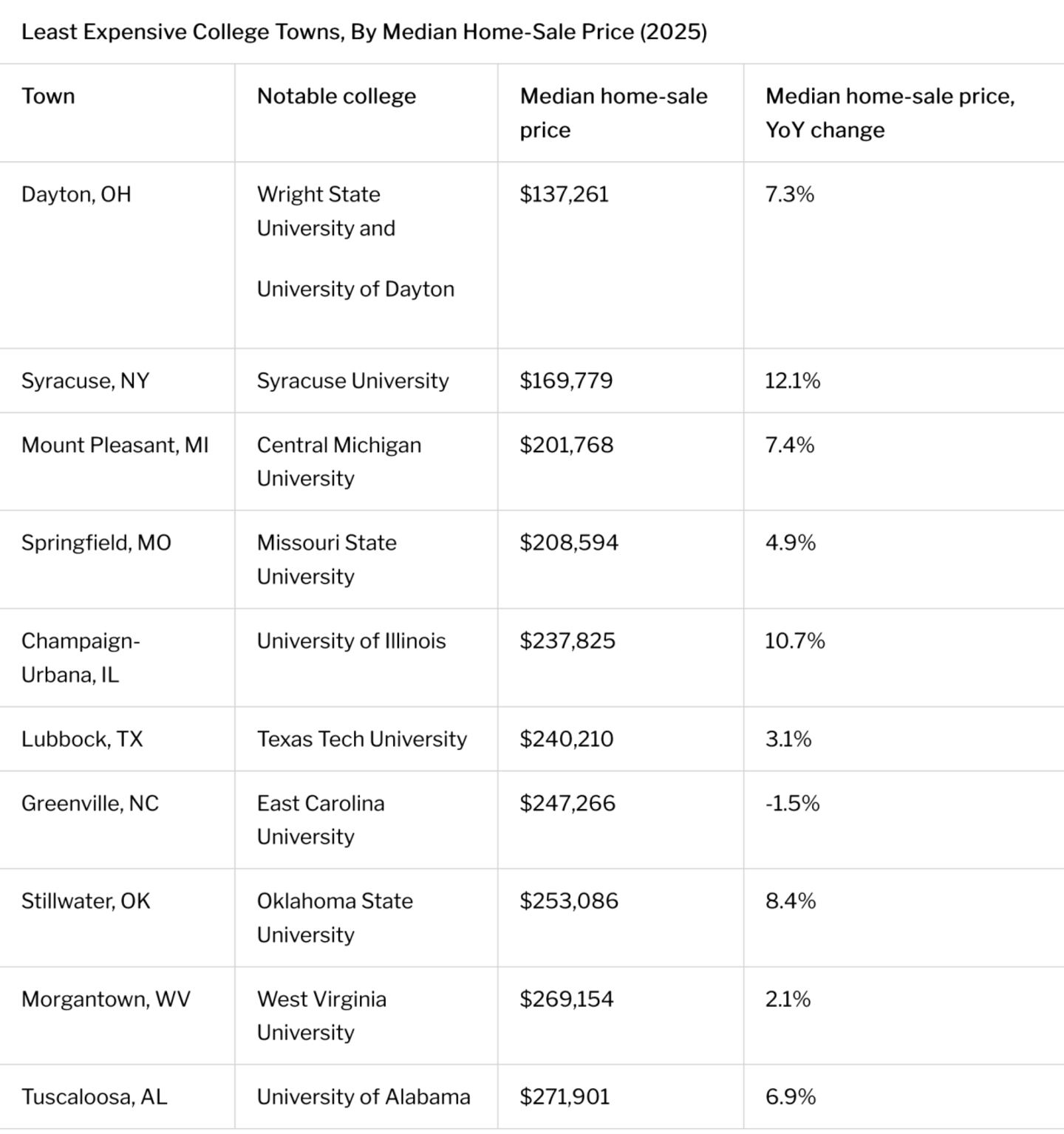 Dayton is the least expensive college town in the U.S., with a median sale price less than a third of the national average. Two more Rust Belt cities, Syracuse and Mount Pleasant, are next. Even including non-college towns, Dayton and Syracuse are among the cheapest places to buy a house in the country.