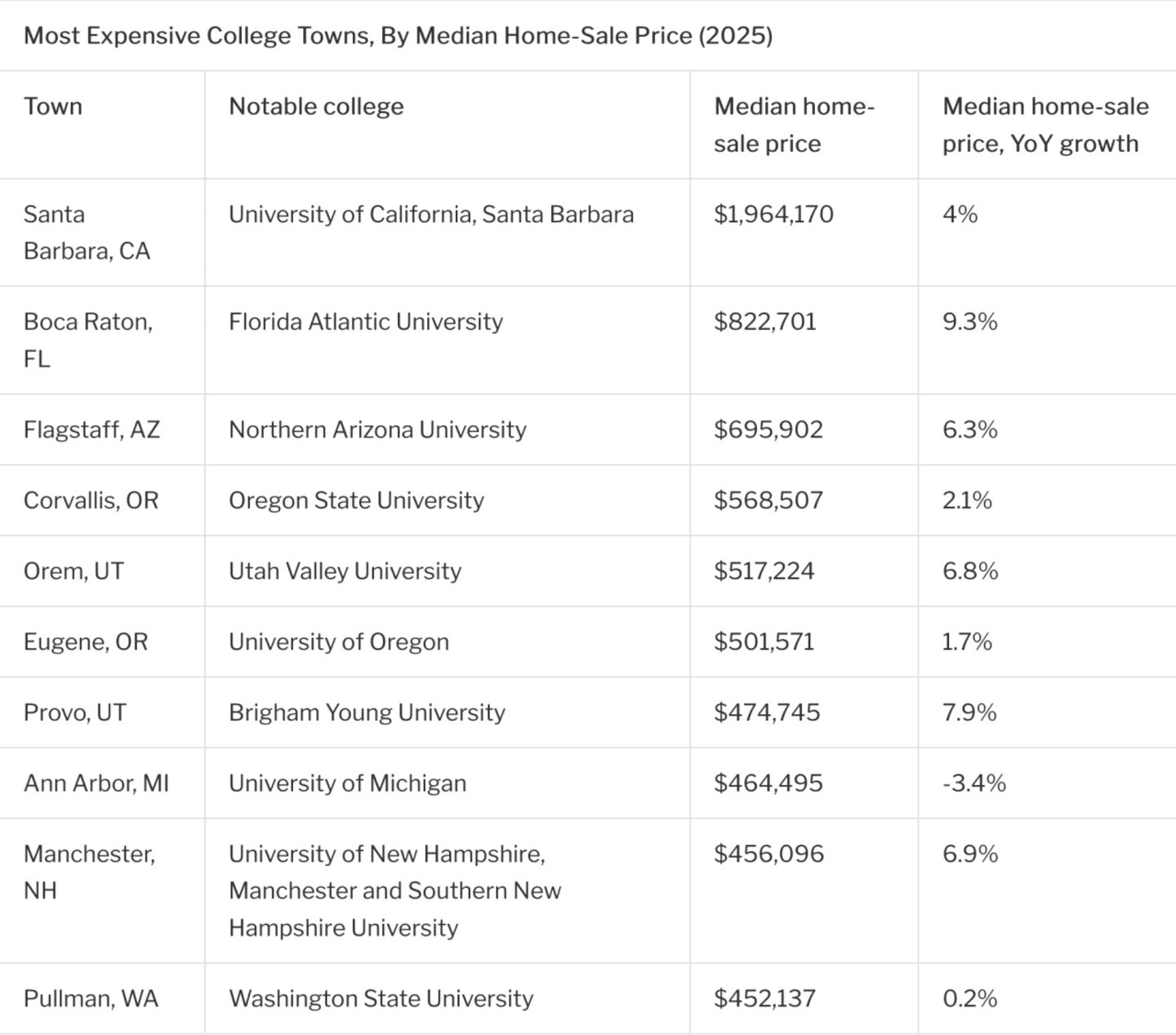Housing data is a weighted average from January to July 2025. Income data comes from the U.S. Census Bureau 2024 ACS 1-year estimate. Tuition data comes from College Board and assumes average financial aid. For information about housing markets in additional college towns, read this.