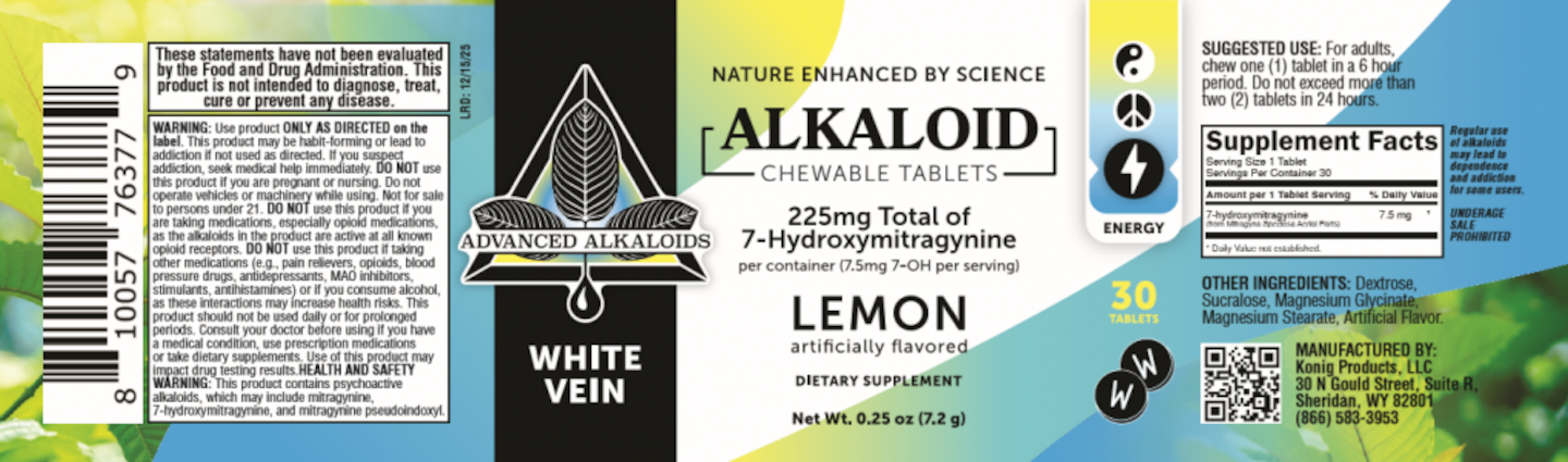 The product is packaged in a 2-count bag with UPC Code 810057763724, in a 20-count bag with UPC Code 810057763830 and in a 30-count bottle with UPC Code 810057763779. The affected Alkaloids Chewable Tablets—White Vein lot has the following lot number: Lot B# AAW.501.3 (all expiration dates). The product can be identified by the lot number on the package and/or the bottom of the bottle. The Alkaloids Chewable Tablets—White Vein product was distributed nationwide to wholesalers, retailers, and consumers via online sales.