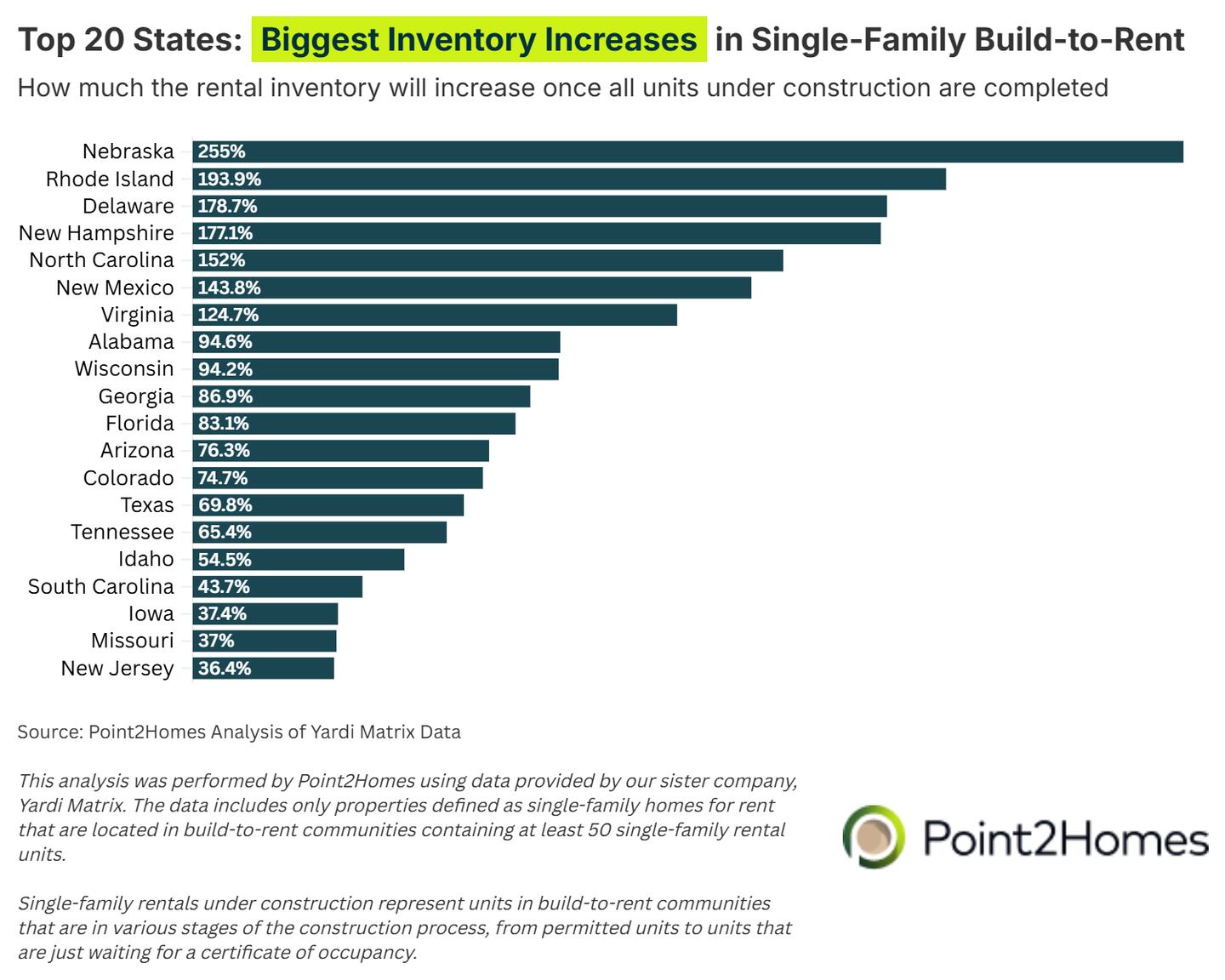This analysis was performed by Point2Homes using data provided by our sister company, Yardi Matrix. The data includes only properties defined as single-family homes for rent that are located in build-to-rent, professionally managed communities in the markets covered by Yardi Matrix research. Data for some markets may not be available and data for the locations included in the analysis may be subject to change. This analysis does not include other types of single-family rentals that are not located in build-to-rent communities.