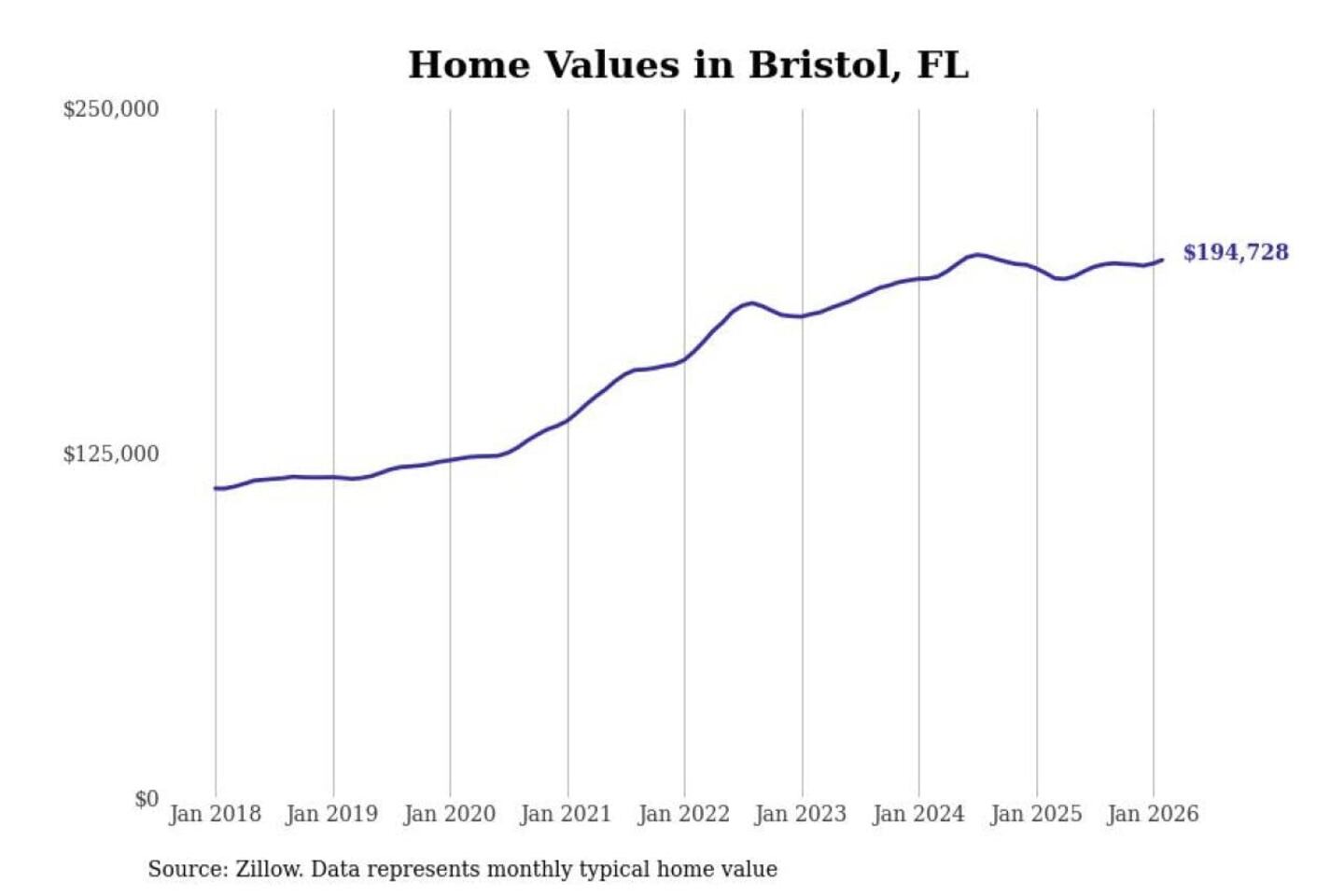 Stacker compiled a list of cities with the fastest-growing home prices in Florida using data from Zillow. Cities are ranked by the dollar change in the Zillow Home Values Index for all homes from the 12 months ending February 2026. The charts in this story were created automatically using Matplotlib. Data was available for 50 cities and towns in Florida.