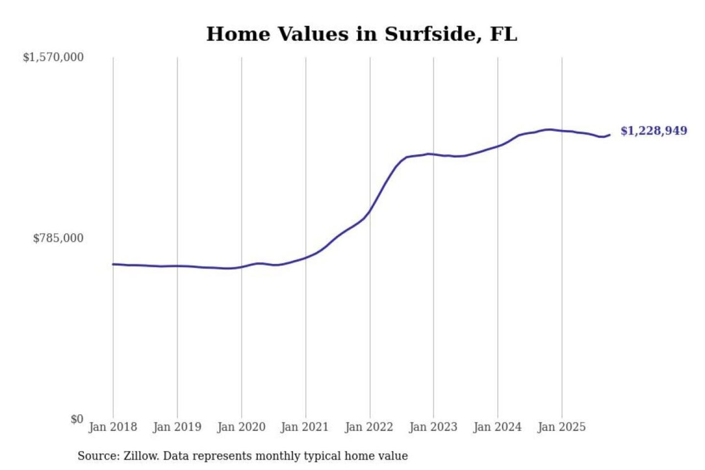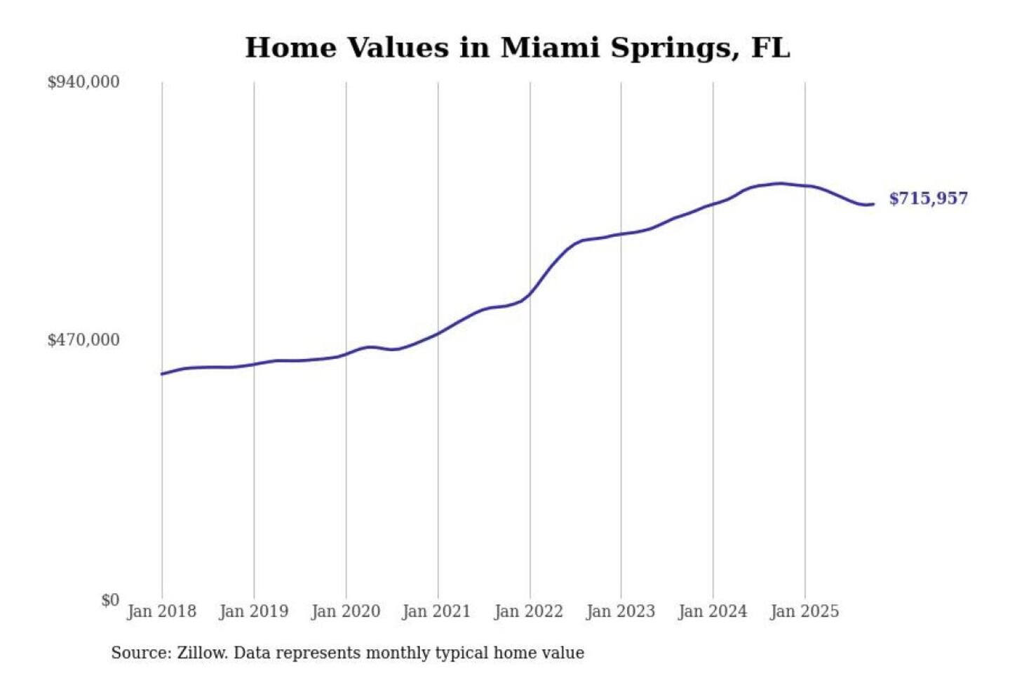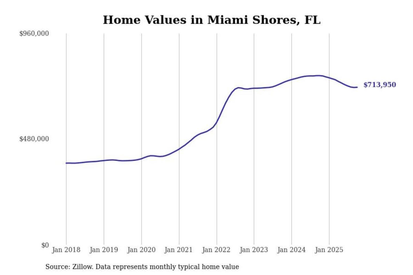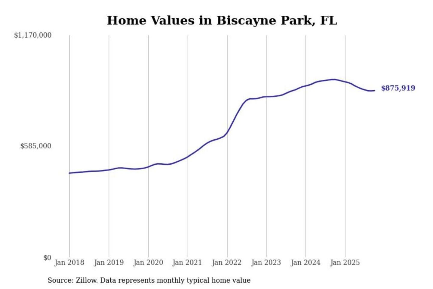 Stacker compiled a list of cities with the most expensive homes in the Miami metro area using data from Zillow. Charts show the monthly typical home value since January 2018. Data was available for 118 cities and towns.