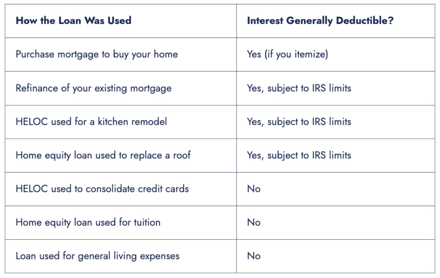 If the loan proceeds were used for personal expenses, such as paying off credit cards, covering tuition, or handling everyday costs, the interest is generally not deductible, even if your home was used as collateral.