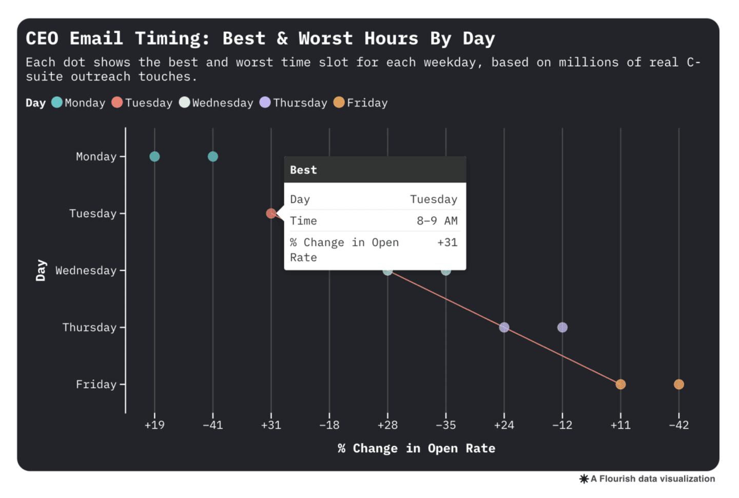 The (maybe) shocking truth: That Friday afternoon email? It's 42% less likely to get opened than a Tuesday morning message. CEOs are already mentally checked out by Friday lunch.