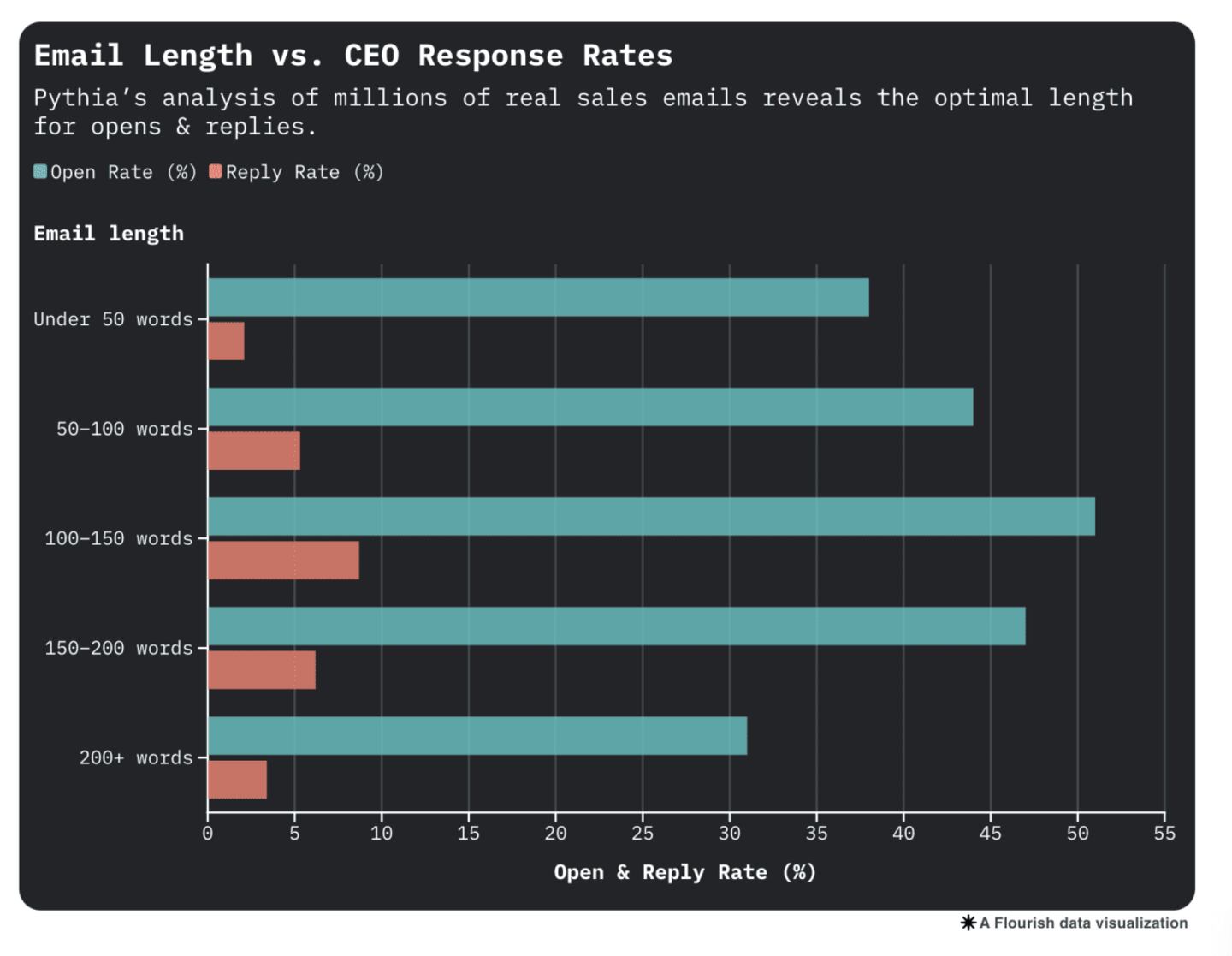 - 100–150 words: 51% Open, 8.7% Reply — Sweet spot