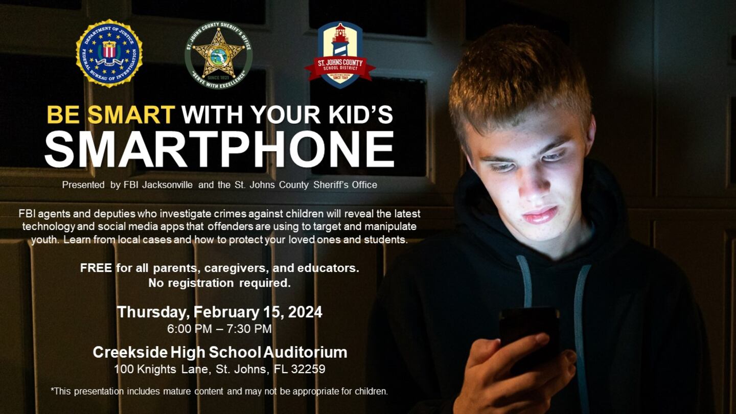 ST. JOHNS COUNTY, Fla — The Federal Bureau of Investigation Jacksonville Division (FBI), St. Johns County Sheriff’s Office (SJSO), and St. Johns County School District (SJCSD) are partnering up again to host the “Be Smart with your Kid’s Smartphone” program on Thursday, February 15 at Creekside High School.