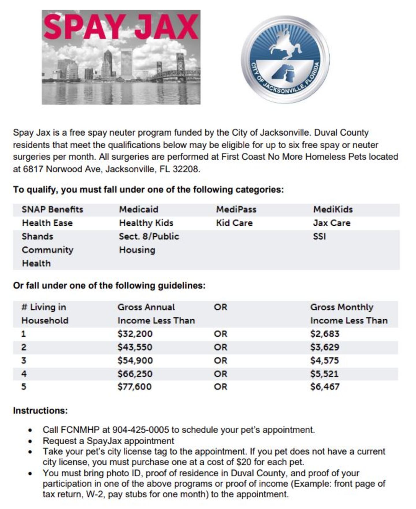 To schedule an appointment, contact First Coast No More Homeless Pets at 904-425-0005.
