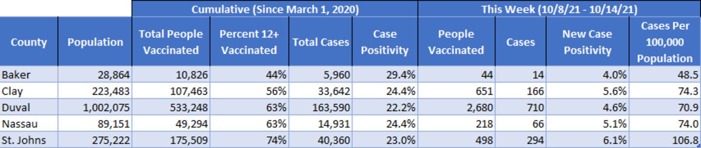 The report also says 243,220 doses of the COVID-19 vaccine were administered for the week, a decline for the second week in a row. 72% of the state have received at least one dose of the COVID-19 vaccine. In terms of vaccine percentage, Northeast Florida remained idle. Baker and Nassau County stayed at 44% for the fourth week in a row, while Clay (56%), Duval (63%) and St. Johns (74%) remained at their percentage for the second straight week.