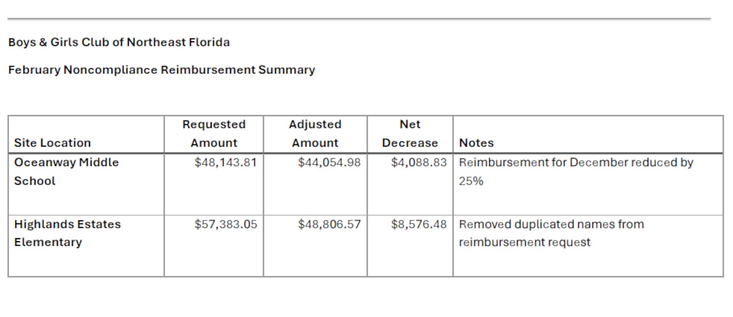 However, two locations operated by the Boys & Girls Clubs faced more serious matters regarding the reporting of attendance numbers. The sites, serving students at Oceanway Middle School and Highlands Elementary School, were denied more than $12,000 in reimbursements due to inaccurate reporting, which works out to 25%.