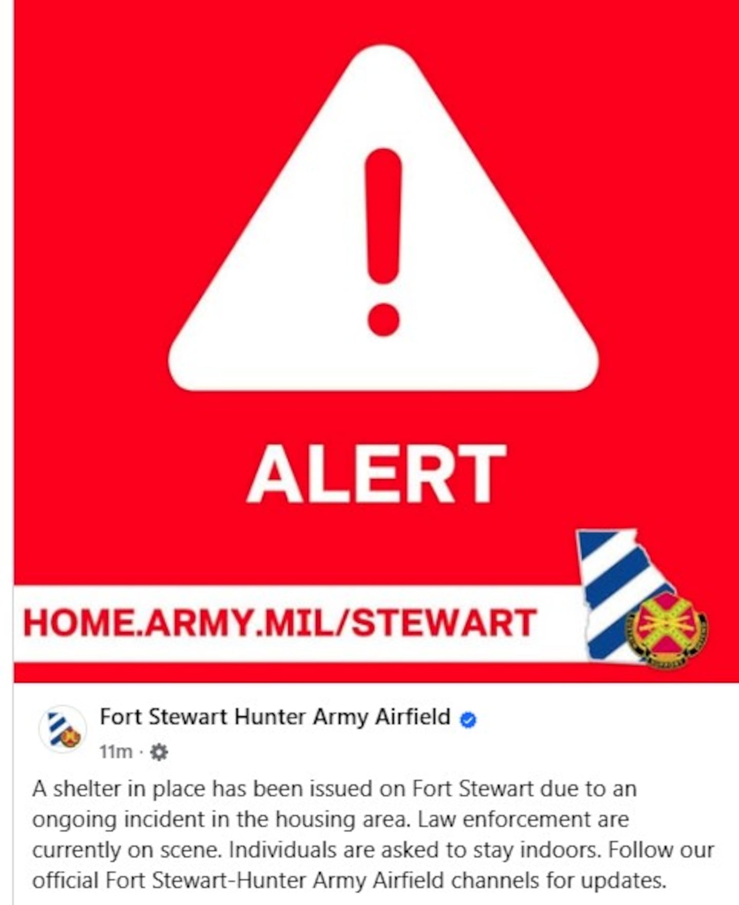 While neither the Hinesville Police Department nor Fort Stewart will confirm the nature of police activity near the residential area of the base, the Third Infantry Division has issued an alert to residents.