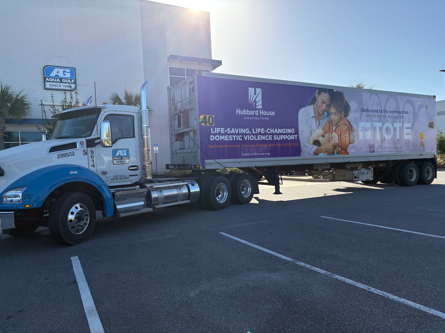 JACKSONVILLE, Fla. — A Jacksonville domestic violence shelter is taking its message of hope far beyond Northeast Florida — all the way across the Southeast and the Caribbean. Hubbard House has partnered with shipping company TOTE Maritime Puerto Rico to unveil a 40-foot shipping container wrapped with domestic violence awareness messaging and the National Domestic Violence Hotline.