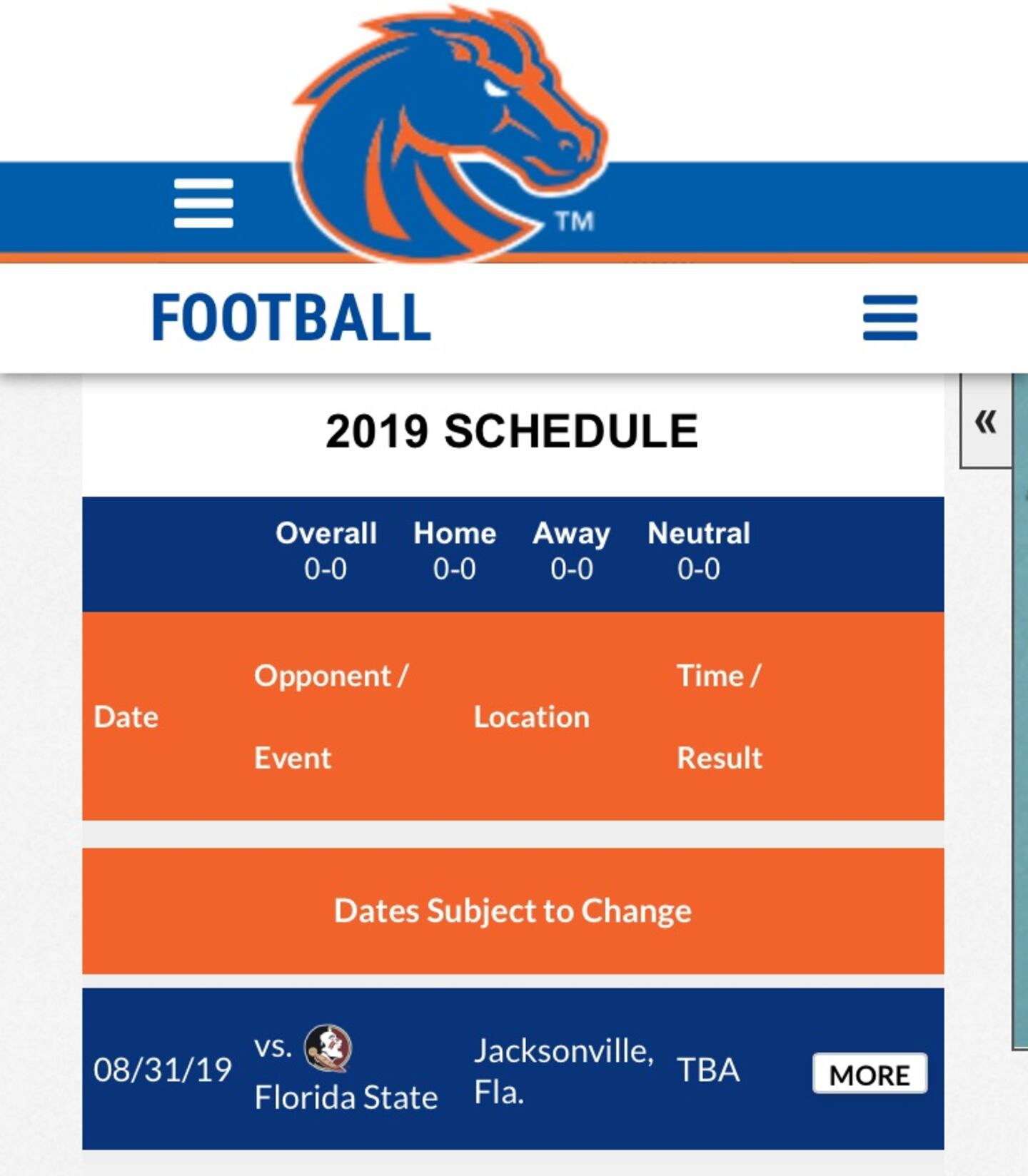 According to the Boise State website, they are playing Florida State University football in Jacksonville on August 31, 2019. The website says this would be an FSU home game.