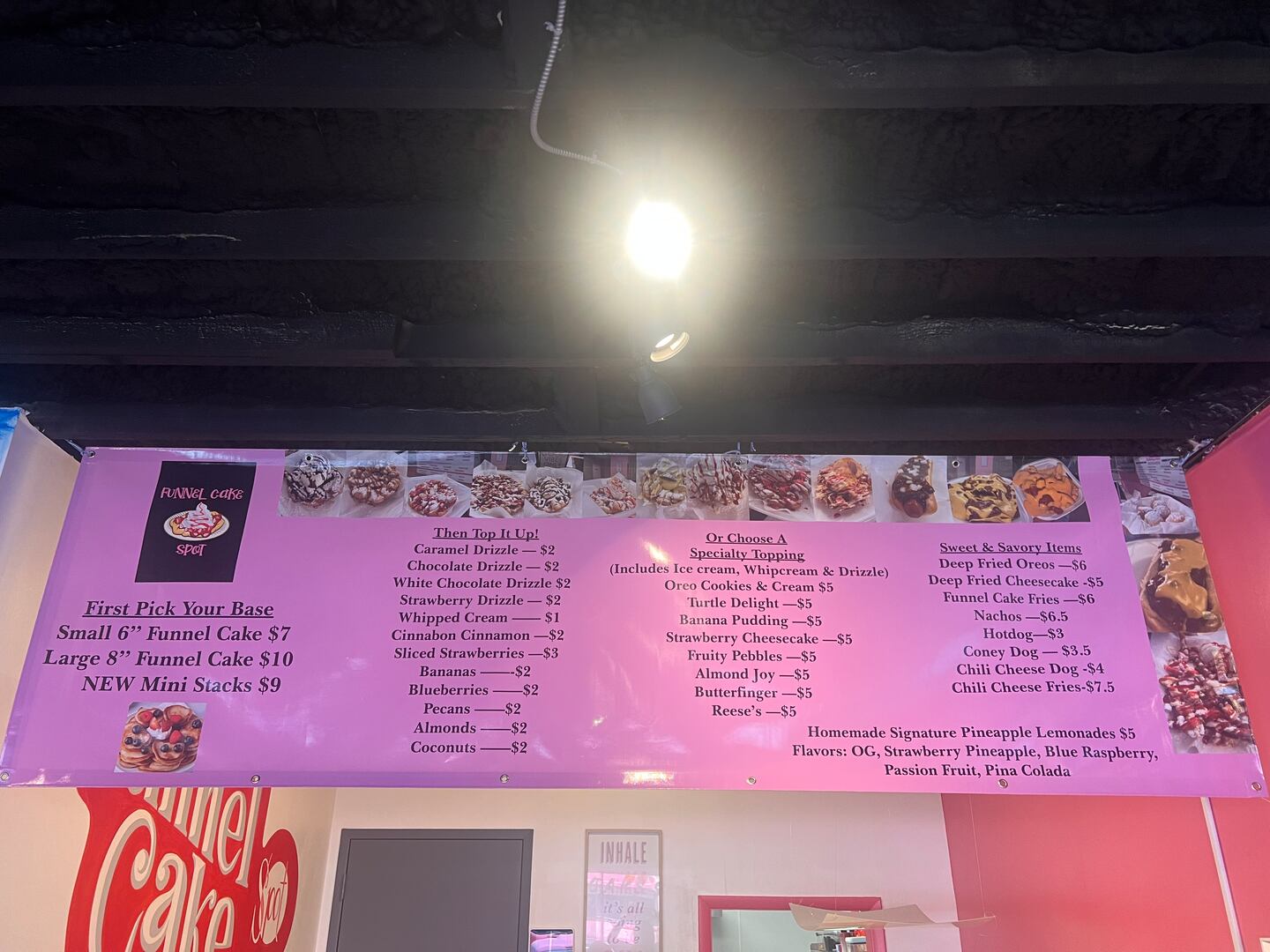 The menu also features funnel cake fries with all the toppings, deep-fried cheesecake, nachos, chili cheese dogs, slaw dogs, and their refreshing pineapple-based lemonades.