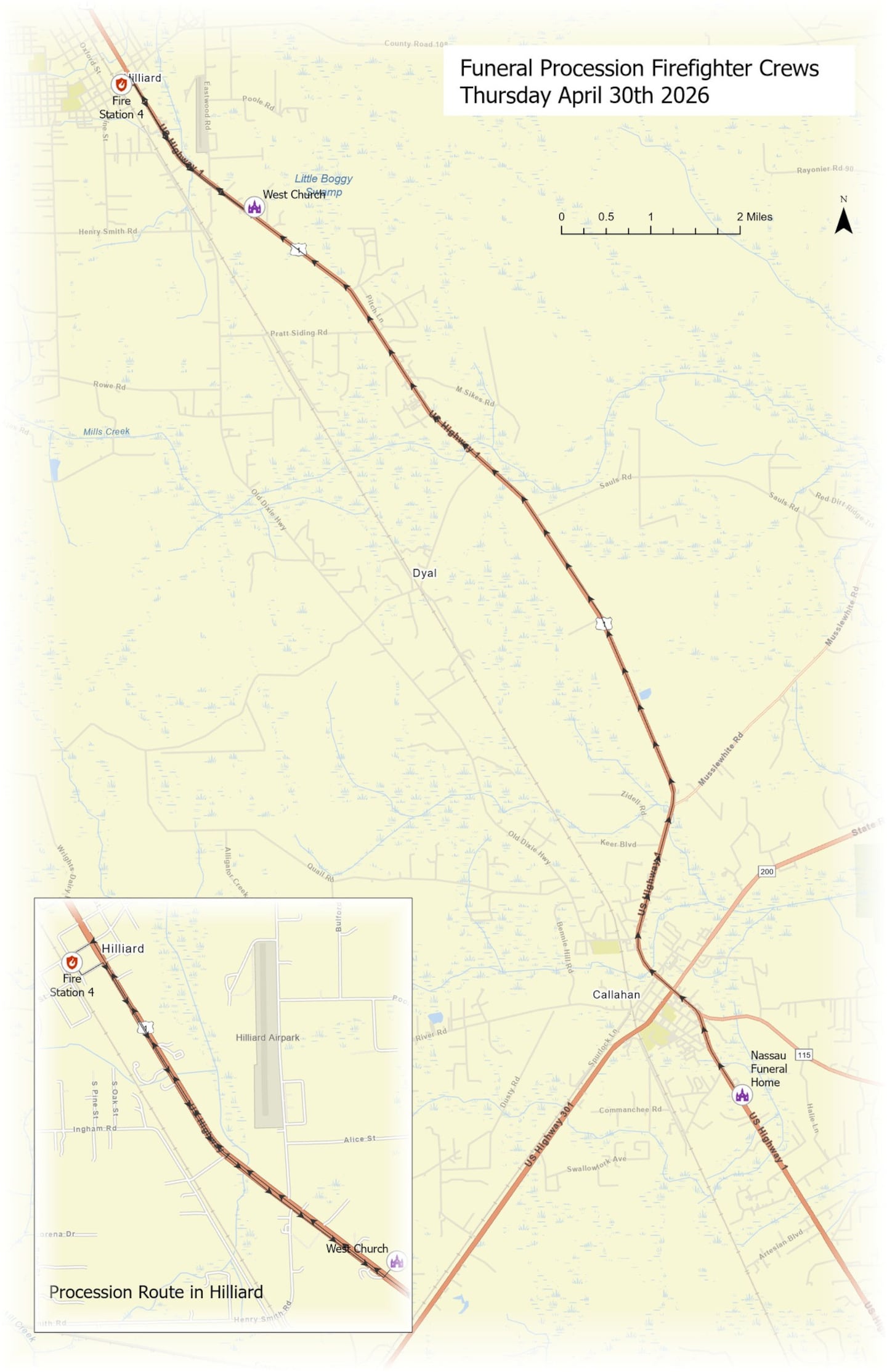 Nassau County also states that before the service, a funeral procession will begin at the Nassau Funeral Home at 8:30 a.m. The route will travel north on US-1, turn left onto CR 108, then proceed left onto Pecan Street, past Fire Station 4, left onto W. 1st Street, and right onto US-1, concluding at West Church.