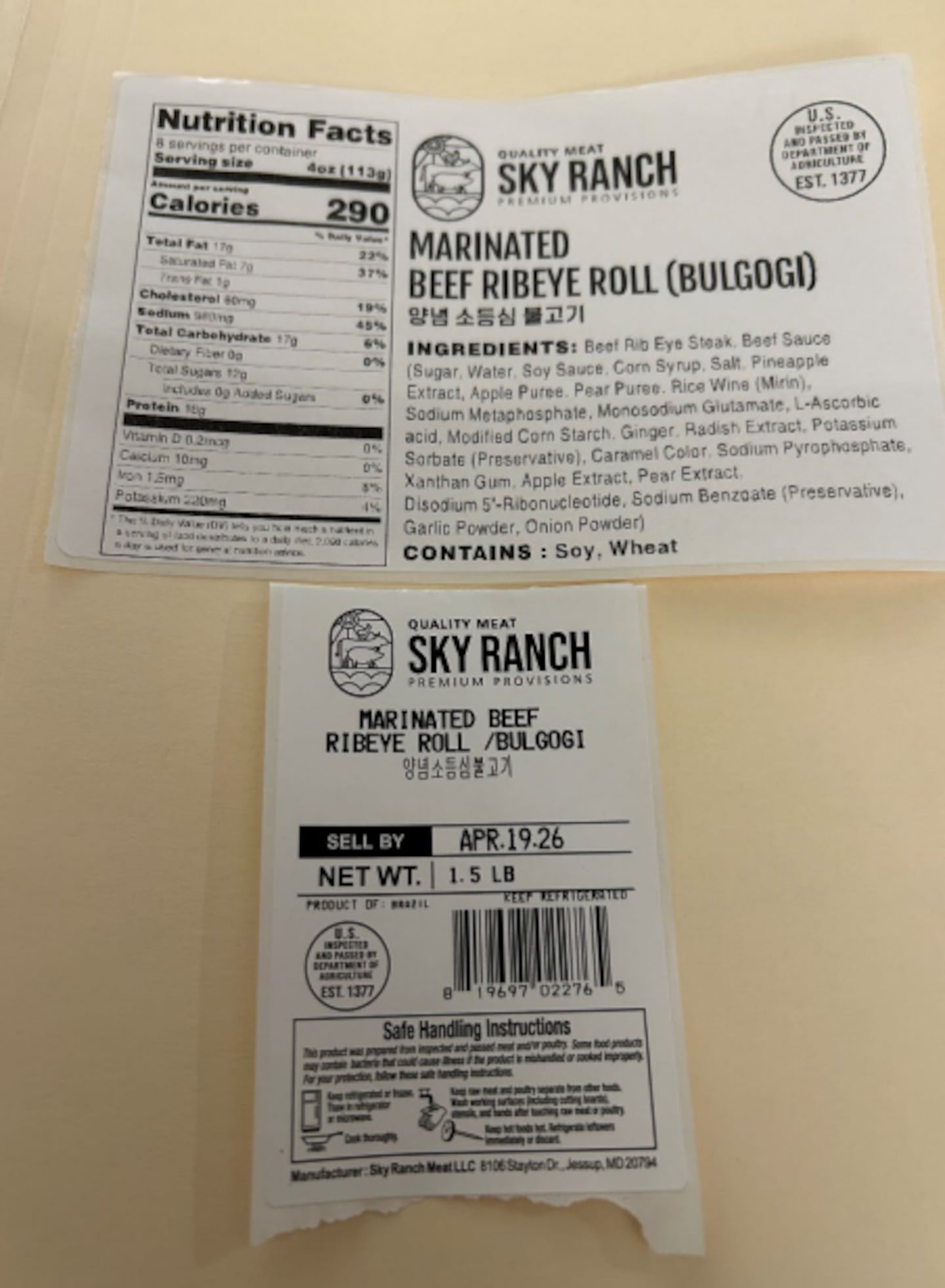 - Quality Meat Sky Ranch Premium Provisions Marinated Beef Ribeye Roll/Bulgogi with sell by dates of “DEC.11.25″ through “APR.16.26″