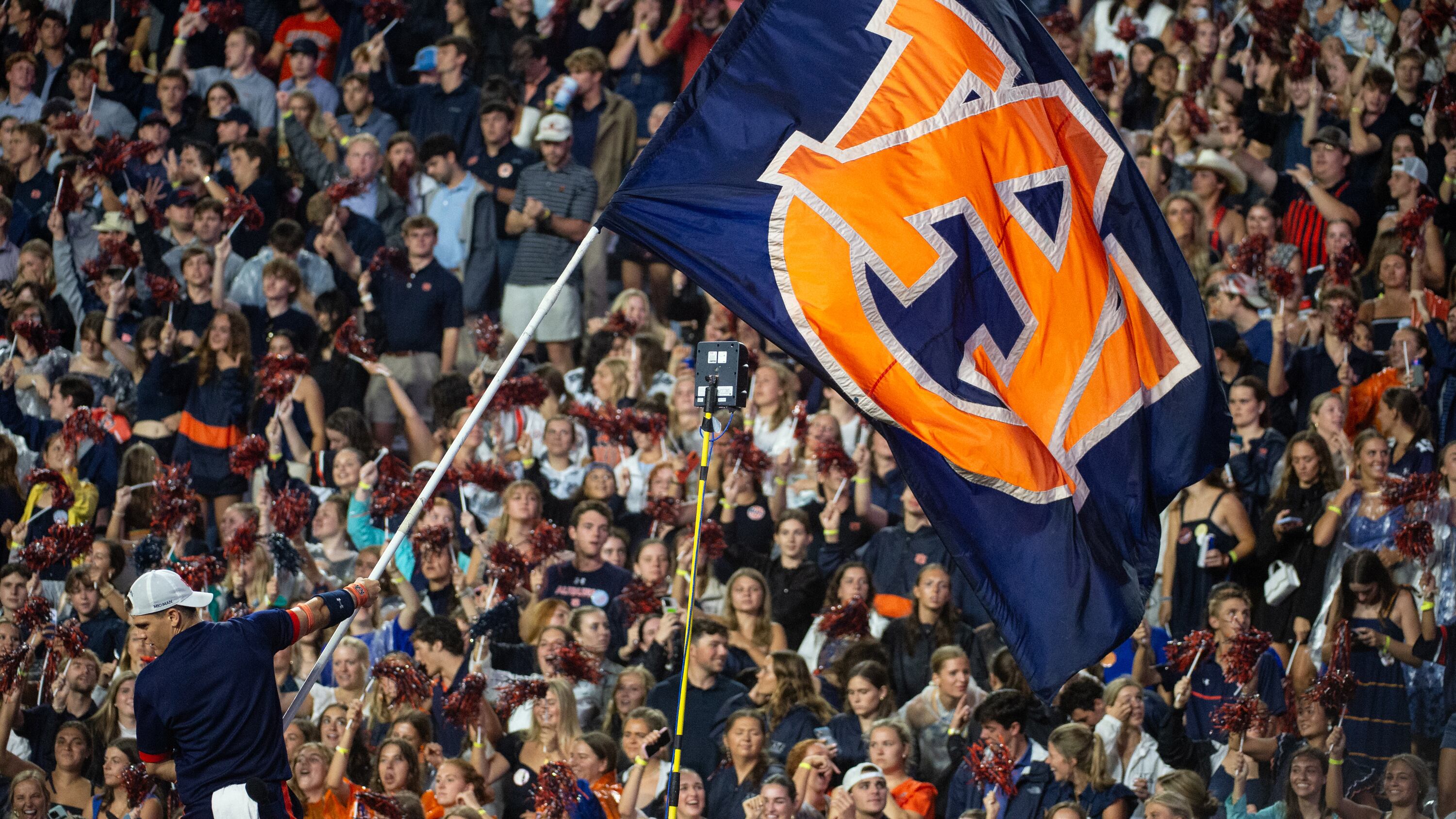 New Mexico v Auburn AUBURN, ALABAMA - SEPTEMBER 14: A cheerleader with the Auburn Tigers waves their flag during their game against the New Mexico Lobos at Jordan-Hare Stadium on September 14, 2024 in Auburn, Alabama. (Photo by Michael Chang/Getty Images) *** Local Caption *** (Michael Chang/Getty Images)