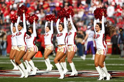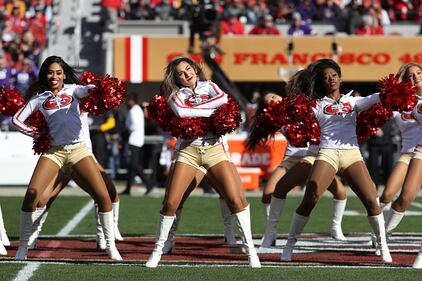Photos: 49ers cheerleaders SANTA CLARA, CALIFORNIA - JANUARY 11: San Francisco 49ers cheerleaders perform during the first half of the NFC Divisional Round Playoff game against the Minnesota Vikings at Levi's Stadium on January 11, 2020 in Santa Clara, California. (Photo by Lachlan Cunningham/Getty Images) (Lachlan Cunningham)