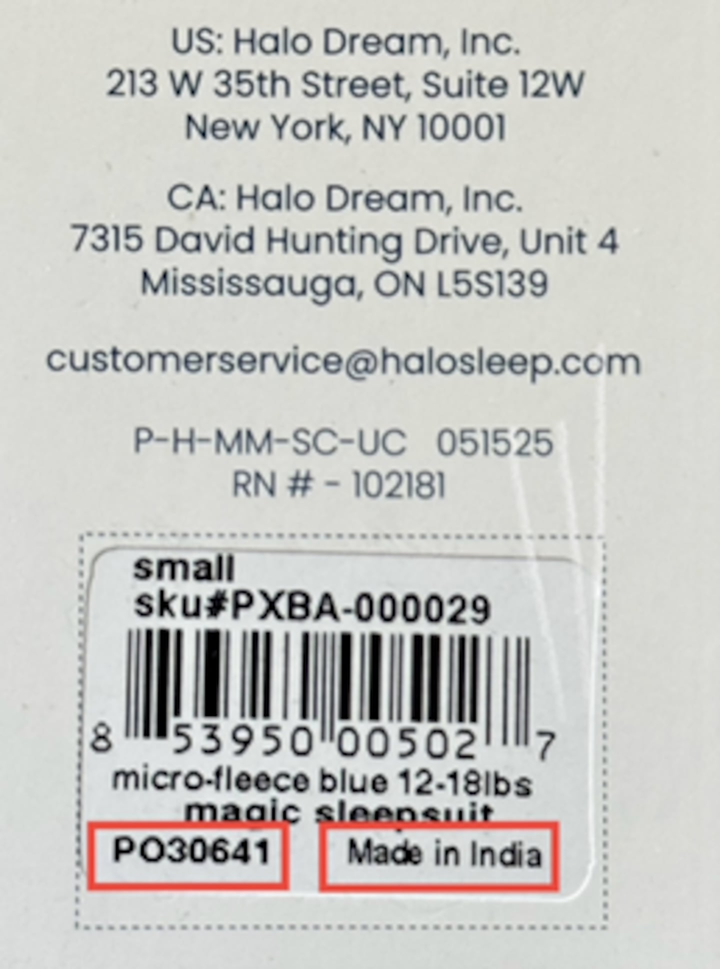 The recall involves HALO Magic Sleepsuits identified with batch codes PO30592, PO30641, and PO 30685. Batch codes and “Made in India” are printed on the front of the sleepsuit and the hang tag attached to the outside of the suit. Sleepsuit shells and linings are made from 100% cotton and the fill is made from 100% polyester. There are double zippers running down each side of the front of the garment. “HALO Magic Sleepsuit” is printed on the front of the sleepsuit.