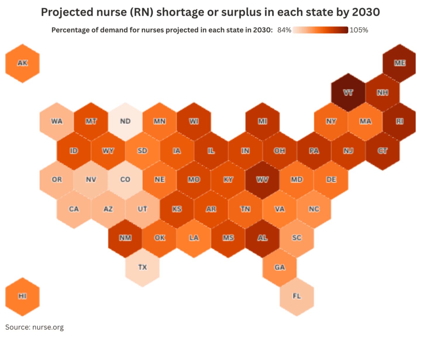 - Vermont (105%) and Maine (103%) are set to have more nurses than needed by 2030.