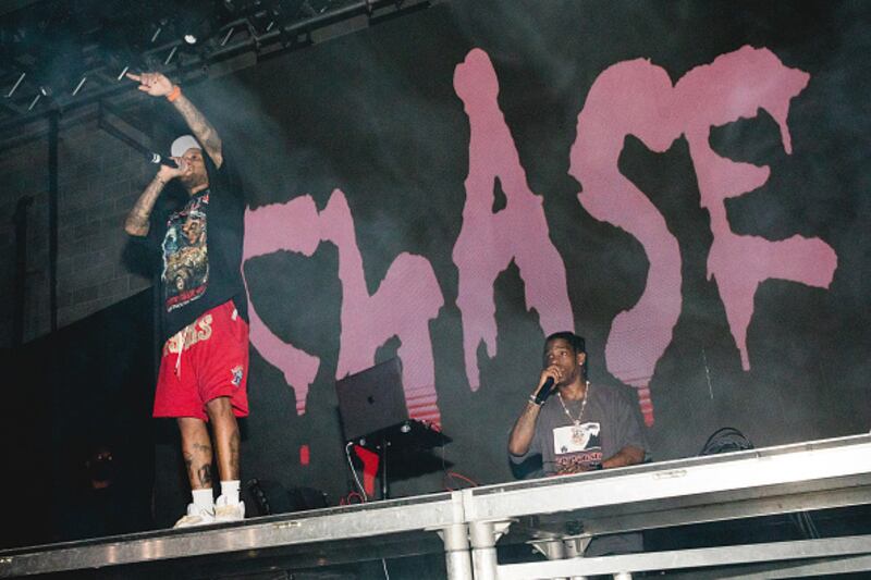 Travis Scott AUSTIN, TEXAS - OCTOBER 23: Travis Scott (R) and Chase B perform onstage during the Bootsy Bellows x Sports Illustrated Circuit Series After Party at Austin American Statesman on October 23, 2021 in Austin, Texas. (Photo by Rick Kern/Getty Images) (RICK KERN/Getty Images)