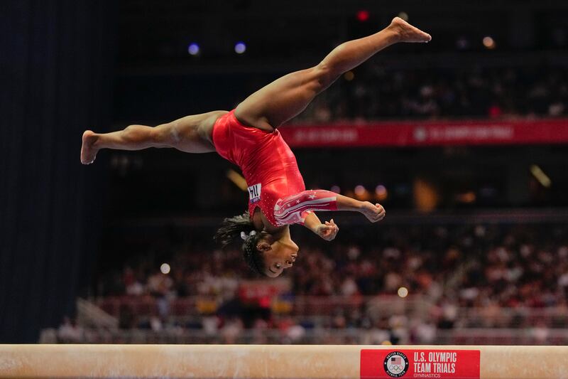 Photos: Simone Biles, Sunisa Lee dominate US women's gymnastics Olympic trials Simone Biles competes on the balance beam during the women's U.S. Olympic Gymnastics Trials Sunday, June 27, 2021, in St. Louis. (AP Photo/Jeff Roberson)
