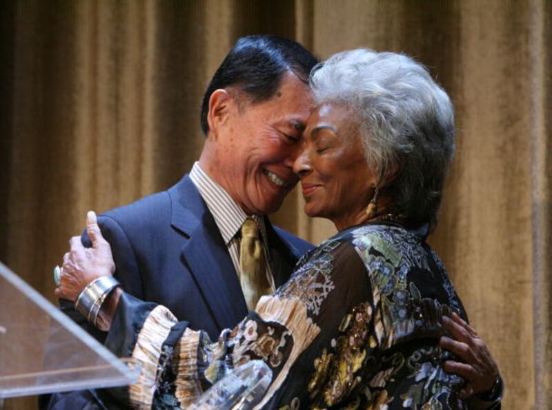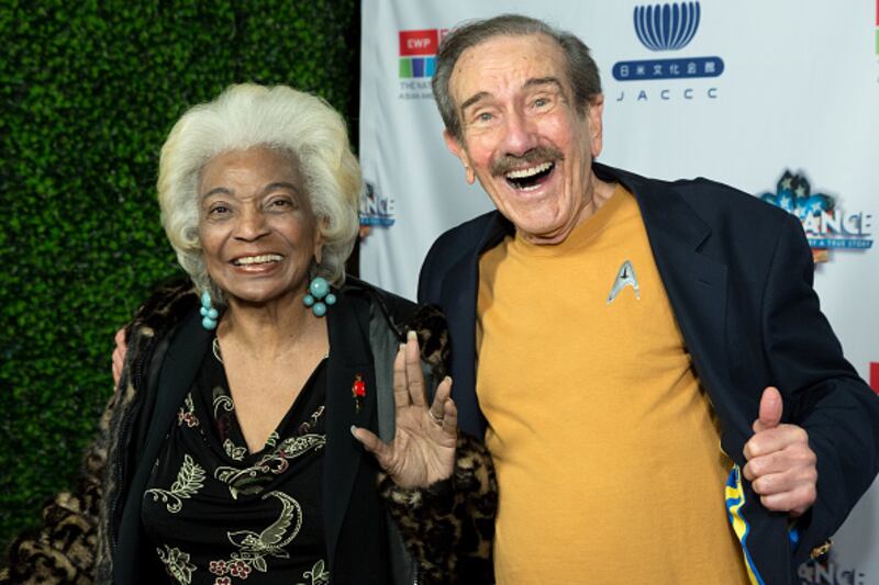Nichelle Nichols through the years LOS ANGELES, CA - MAY 01: Actress Nichelle Nichols (L) and actor George Takei attend the 2014 LA Asian Pacific Film Festival opening night for 'To Be Takei' at Directors Guild Of America on May 1, 2014 in Los Angeles, California. (Photo by Imeh Akpanudosen/Getty Images) (Imeh Akpanudosen/Getty Images)