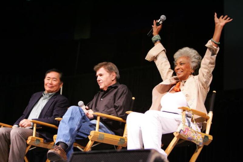 Nichelle Nichols through the years Las Vegas, UNITED STATES: Nichelle Nichols (R), Walter Koenig (C) and George Takei (L), the actors who portrayed Lt. Uhura, Ensign Chekov and Lt Sulu respectively in the original Star Trek television series, recall memories of filming the show 40 years ago, at the Star Trek convention in Las Vegas, Nevada, 19 August 2006. Thousands of fans beamed into Las Vegas this weekend to celebrate the 40th anniversary of Star Trek, the enduring science fiction television franchise whose cult appeal transcends boundaries of space and time. AFP PHOTO / Robyn BECK (Photo credit should read ROBYN BECK/AFP via Getty Images) (ROBYN BECK/AFP via Getty Images)