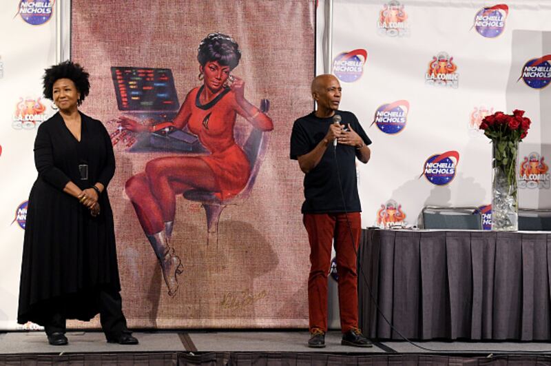 Nichelle Nichols through the years LOS ANGELES, CALIFORNIA - DECEMBER 05: Dr. Mae Jemison (L) and and Kyle Johnson are seen onstage at the Nichelle Nichols Finale Celebration during 2021 Los Angeles Comic Con at Los Angeles Convention Center on December 05, 2021 in Los Angeles, California. (Photo by Chelsea Guglielmino/Getty Images) (Chelsea Guglielmino/Getty Images)