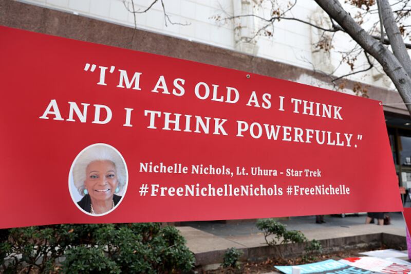 Nichelle Nichols through the years LOS ANGELES, CALIFORNIA - JANUARY 10: Signs of support are seen at a rally for actress and civil rights activist Nichelle Nichols to free her from her conservatorship at Stanley Mosk Courthouse on January 10, 2022 in Los Angeles, California. (Photo by Rich Fury/Getty Images) (Rich Fury/Getty Images)
