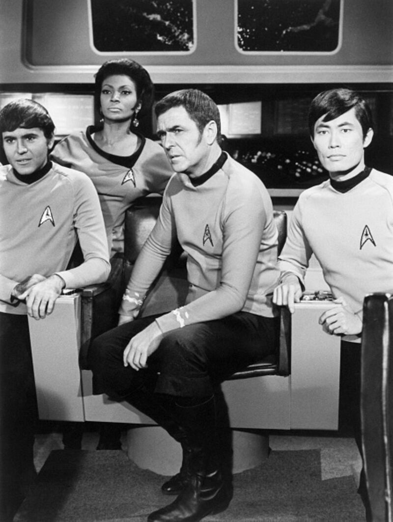 Nichelle Nichols through the years Aboard the main deck of the USS Enterprise are (left to right): Chekov (Walter Koenig), Uhura (Nichelle Nichols), Scotty (James Doohan), and Sulu (George Takei). (Bettmann/Bettmann Archive via Getty Images)