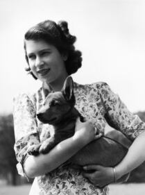 Photos: Queen Elizabeth II through the years 1944: Princess Elizabeth holding Sue, a corgi pup, in the grounds of Windsor Castle, Berkshire, on May 30, 1944. (Lisa Sheridan/Hulton Archive/Getty Images)