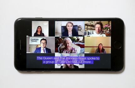 Queen Elizabeth II through the years 2020: In this photo illustration, Anne, Princess Royal, and Queen Elizabeth II speak to carers via video call to mark Carers Week 2020 on June 11, 2020, in London. (Chris Jackson/Getty Images)