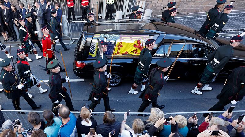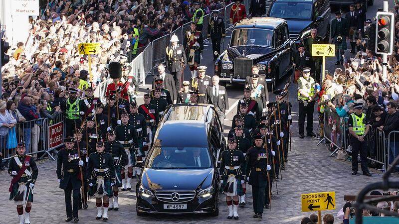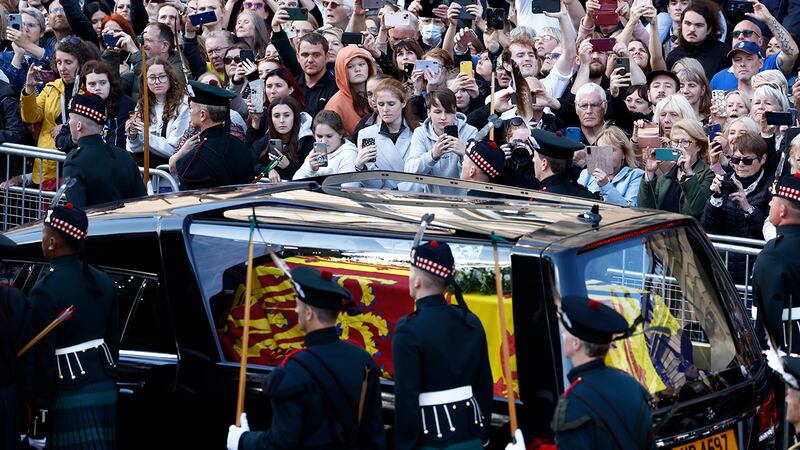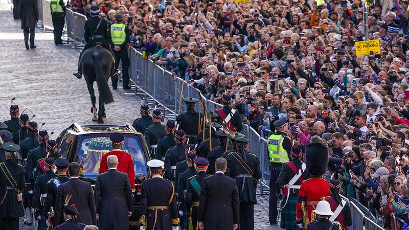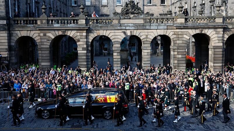 Crowds watch procession for Queen Elizabeth II's coffin in Scotland People gather in tribute as the cortege carrying the coffin of the late Queen Elizabeth II passes on September 12, 2022 in Edinburgh, Scotland. King Charles III joins the procession accompanying Her Majesty The Queen's coffin from the Palace of Holyroodhouse along the Royal Mile to St Giles Cathedral. The King and The Queen Consort, accompanied by other Members of the Royal Family also attend a Service of Prayer and Reflection for the Life of The Queen where it lies in rest for 24 hours before being transferred by air to London. (Photo by Peter Summers/Getty Images) (Peter Summers/Getty Images)