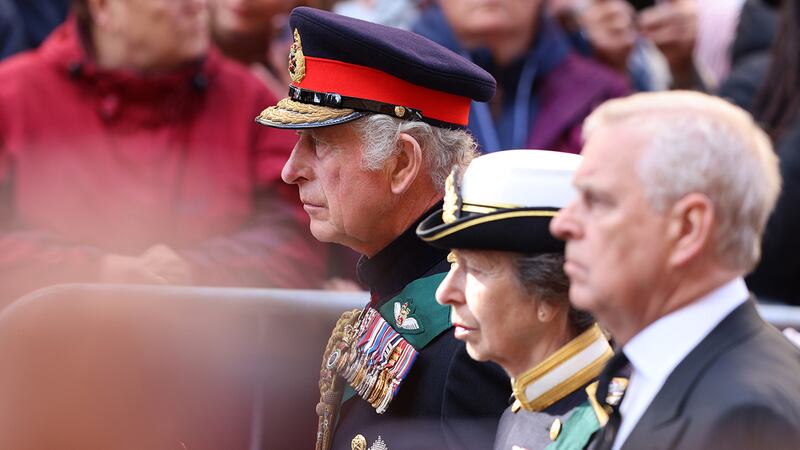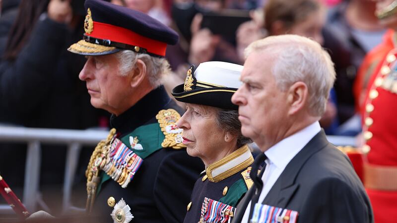 Crowds watch procession for Queen Elizabeth II's coffin in Scotland King Charles III, Prince Andrew, Duke of York and Princess Anne, Princess Royal take part in the procession of Her Majesty The Queen Elizabeth II's Coffin as it heads to St Giles Cathedral, after making its way along The Royal Mile on September 12, 2022 in Edinburgh, Scotland. King Charles III joins the procession accompanying Her Majesty The Queen's coffin from the Palace of Holyroodhouse along the Royal Mile to St Giles Cathedral. The King and The Queen Consort, accompanied by other Members of the Royal Family also attend a Service of Prayer and Reflection for the Life of The Queen where it lies in rest for 24 hours before being transferred by air to London. (Photo by Jeff J Mitchell/Getty Images) (Jeff J Mitchell/Getty Images)