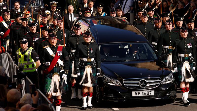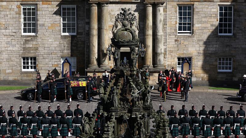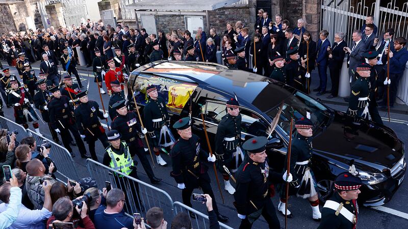 Crowds watch procession for Queen Elizabeth II's coffin in Scotland The hearse carrying the coffin of Queen Elizabeth departs Holyrood Palace, on September 12, 2022 in Edinburgh, Scotland. King Charles III joins the procession accompanying Her Majesty The Queen's coffin from the Palace of Holyroodhouse along the Royal Mile to St Giles Cathedral. The King and The Queen Consort, accompanied by other Members of the Royal Family also attend a Service of Prayer and Reflection for the Life of The Queen where it lies in rest for 24 hours before being transferred by air to London. (Photo Phil Noble - WPA Pool/Getty Images) (WPA Pool/Getty Images)