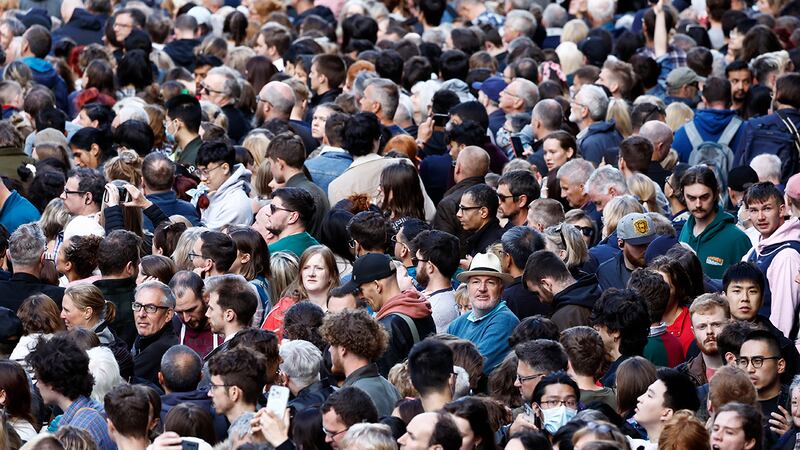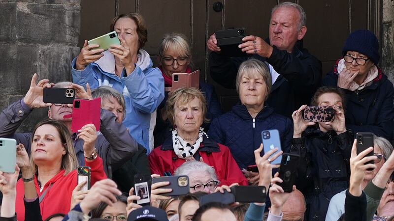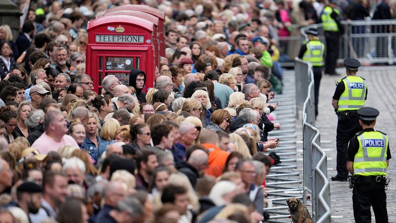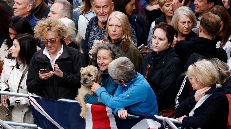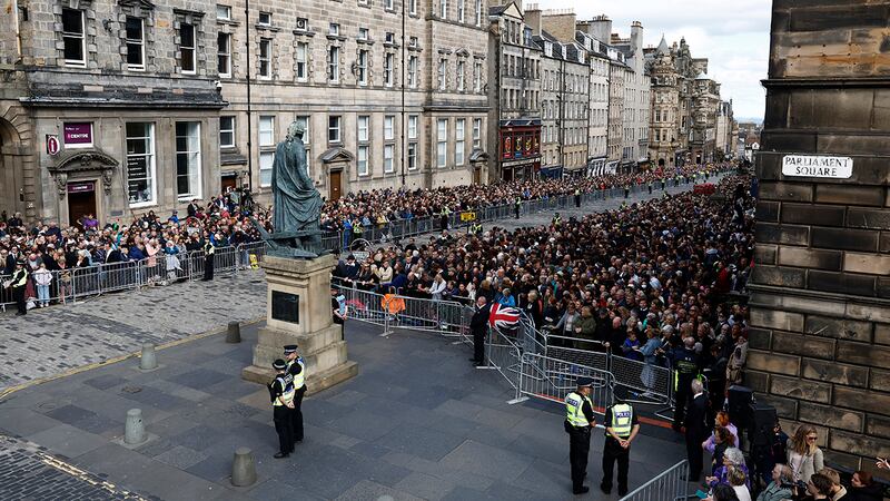 Crowds watch procession for Queen Elizabeth II's coffin in Scotland People wait to watch the Procession of Queen Elizabeth's coffin from the Palace of Holyroodhouse to St Giles Cathedral on the Royal Mile, on September 12, 2022 in Edinburgh, Scotland. King Charles III joins the procession accompanying Her Majesty The Queen's coffin from the Palace of Holyroodhouse along the Royal Mile to St Giles Cathedral. The King and The Queen Consort, accompanied by other Members of the Royal Family also attend a Service of Prayer and Reflection for the Life of The Queen where it lies in rest for 24 hours before being transferred by air to London. (Photo by Jon Super - WPA Pool/Getty Images) (WPA Pool/Getty Images)