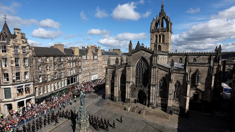 Crowds watch procession for Queen Elizabeth II's coffin in Scotland Members of the public gather to watch the procession of Queen Elizabeth II's coffin, from the Palace of Holyroodhouse to St Giles Cathedral, on the Royal Mile on September 12, 2022 in Edinburgh, Scotland. King Charles III joins the procession accompanying Her Majesty The Queen's coffin from the Palace of Holyroodhouse along the Royal Mile to St Giles Cathedral. The King and The Queen Consort, accompanied by other Members of the Royal Family also attend a Service of Prayer and Reflection for the Life of The Queen where it lies in rest for 24 hours before being transferred by air to London. (Photo by Odd Andersen/WPA Pool/Getty Images) (WPA Pool/Getty Images)