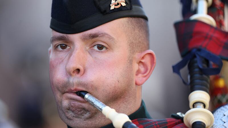 Queen Elizabeth II's coffin leaves Scotland for London Pipers march on September 13, 2022 in Edinburgh, Scotland. The coffin carrying Her Majesty Queen Elizabeth II leaves St Giles Church travelling to Edinburgh Airport where it will be flown to London and transferred to Buckingham Palace by road. Queen Elizabeth II died at Balmoral Castle in Scotland on September 8, 2022, and is succeeded by her eldest son, King Charles III. (Photo by Robert Perry/Getty Images) (Robert Perry/Getty Images)