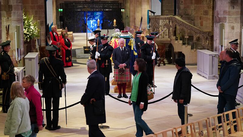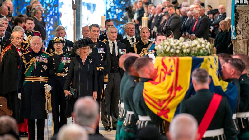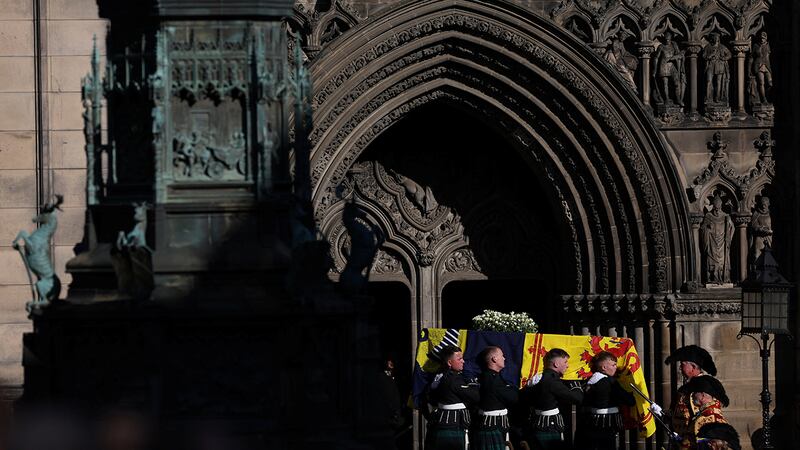 Royal family attends vigil for Queen Elizabeth II The bearer party carry the coffin of Queen Elizabeth II in to a Service of Prayer and Reflection for her life at St Giles' Cathedral on September 12, 2022 in Edinburgh, Scotland. (Photo Jane Barlow - WPA Pool/Getty Images) (WPA Pool/Getty Images)
