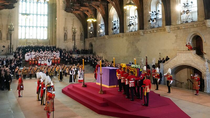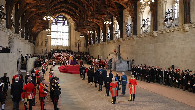 Photos: Thousands line procession route to honor Queen Elizabeth II A general view as the coffin carrying Queen Elizabeth II rests in Westminster Hall for the Lying-in State on September 14, 2022 in London, England. Queen Elizabeth II's coffin is taken in procession on a Gun Carriage of The King's Troop Royal Horse Artillery from Buckingham Palace to Westminster Hall where she will lay in state until the early morning of her funeral. Queen Elizabeth II died at Balmoral Castle in Scotland on September 8, 2022, and is succeeded by her eldest son, King Charles III. (Dan Kitwood/Getty Images)