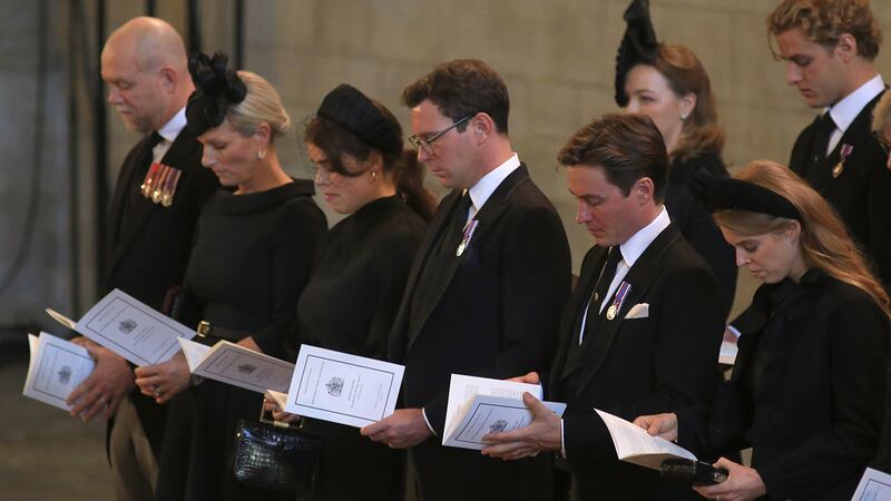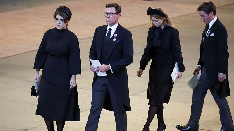 Photos: Mourners pay respects as Queen Elizabeth II lies in state (L-R) Princess Eugenie, her husband Jack Brooksbank, Princess Beatrice and husband Edoardo Mapelli Mozzi walk as procession with the coffin of Britain's Queen Elizabeth arrives at Westminster Hall from Buckingham Palace for her lying in state on September 14, 2022 in London, United Kingdom. Queen Elizabeth II's coffin is taken in procession on a Gun Carriage of The King's Troop Royal Horse Artillery from Buckingham Palace to Westminster Hall where she will lay in state until the early morning of her funeral. Queen Elizabeth II died at Balmoral Castle in Scotland on September 8, 2022, and is succeeded by her eldest son, King Charles III. (WPA Pool/Getty Images)