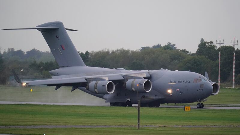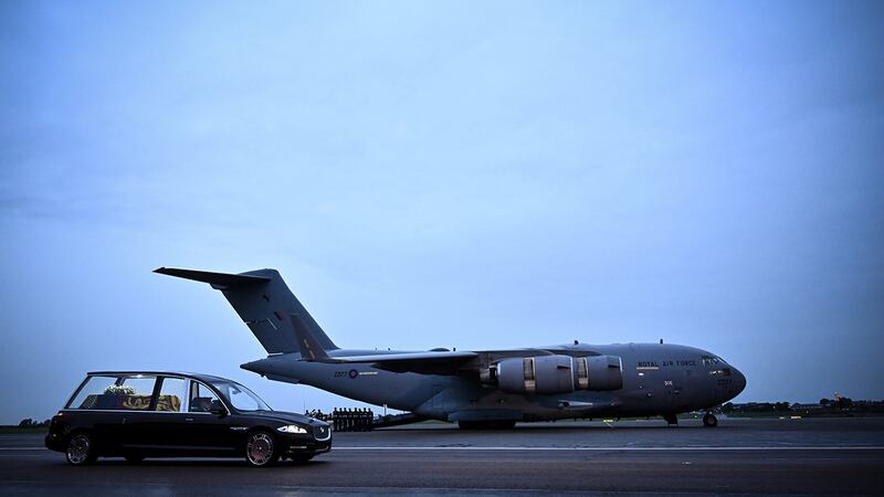 Queen Elizabeth II's coffin arrives in London The RAF aircraft, a C-17 globemaster from 99 squadron carrying the coffin of Queen Elizabeth II lands at RAF Northolt, west London, from where it will be taken to Buckingham Palace, London, to lie at rest overnight in the Bow Room on September 13, 2022 in London, England. The coffin carrying Her Majesty Queen Elizabeth II leaves St Giles Church travelling to Edinburgh Airport where it will be flown to London and transferred to Buckingham Palace by road. Queen Elizabeth II died at Balmoral Castle in Scotland on September 8, 2022, and is succeeded by her eldest son, King Charles III. (Photo by Andrew Matthews - WPA Pool/Getty Images) (WPA Pool/Getty Images)