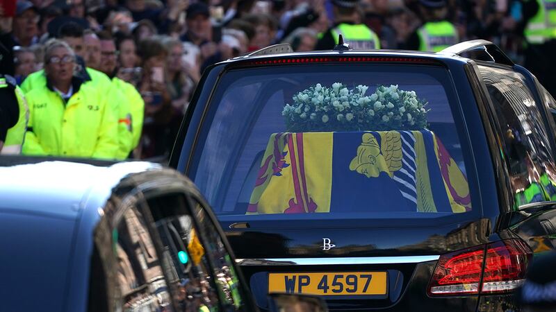 Queen Elizabeth II's coffin leaves Scotland for London The late Queen Elizabeth II's coffin is driven in a hearse from St Giles Church on September 13, 2022 in Edinburgh, Scotland. The coffin carrying Her Majesty Queen Elizabeth II leaves St Giles Church travelling to Edinburgh Airport where it will be flown to London and transferred to Buckingham Palace by road. Queen Elizabeth II died at Balmoral Castle in Scotland on September 8, 2022, and is succeeded by her eldest son, King Charles III. (Photo by Ian Forsyth/Getty Images) (Ian Forsyth/Getty Images)