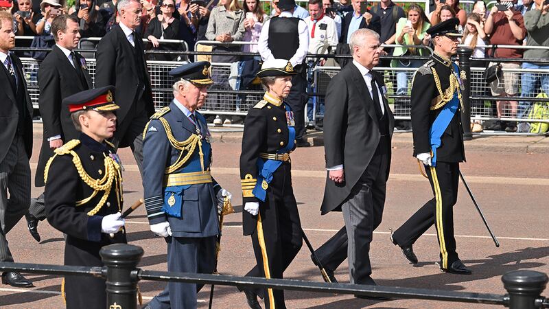King Charles III and his sons, Prince William and Prince Harry, are walking with Prince Andrew, Prince Edward and Princess Anne behind the late Queen's coffin