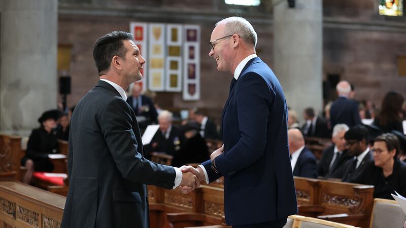 Photos: King Charles III visits Northern Ireland Steve Baker Minister of State in the Northern Ireland (left) and Minister for Foreign Affairs and Defence Simon Coveney attend a Service of Reflection for Queen Elizabeth II at St Anne's Cathedral on September 13, 2022 in Belfast, Northern Ireland. Charles and Camilla are visiting the four home nations of the UK in the run-up to the state funeral for Queen Elizabeth II on Monday. (Photo Liam McBurney - WPA Pool/Getty Images) (WPA Pool/Getty Images)