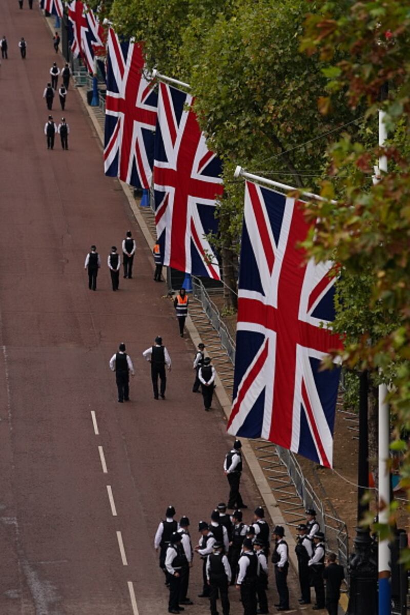 Photos: Crowds gather ahead of Queen Elizabeth II's coffin procession Police officers cross The Mall on September 14, 2022, in London. (Victoria Jones - Pool/Getty Images)