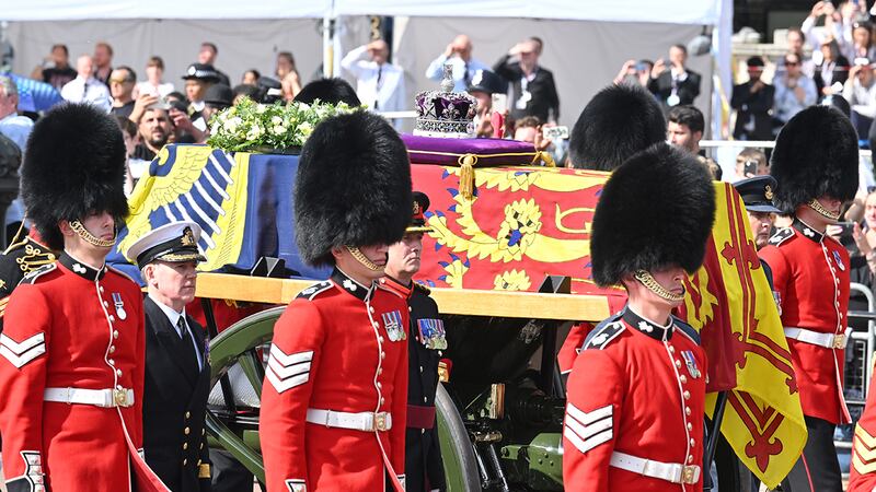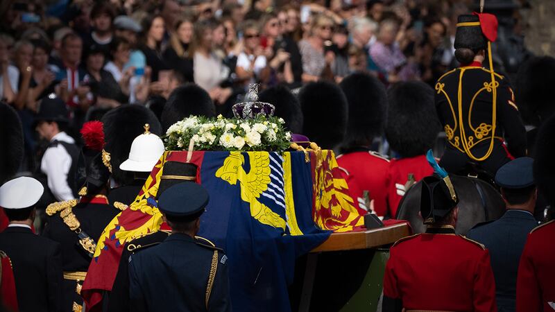 Photos: Thousands line procession route to honor Queen Elizabeth II The coffin of Queen Elizabeth II, draped in the Royal Standard with the Imperial State Crown placed on top, is carried on a horse-drawn gun carriage of the King's Troop Royal Horse Artillery, during the ceremonial procession of the coffin of Queen Elizabeth II from Buckingham Palace to Westminster Hall on September 14, 2022 in London, United Kingdom. Queen Elizabeth II's coffin is taken in procession on a Gun Carriage of The King's Troop Royal Horse Artillery from Buckingham Palace to Westminster Hall where she will lay in state until the early morning of her funeral. Queen Elizabeth II died at Balmoral Castle in Scotland on September 8, 2022, and is succeeded by her eldest son, King Charles III. (WPA Pool/Getty Images)