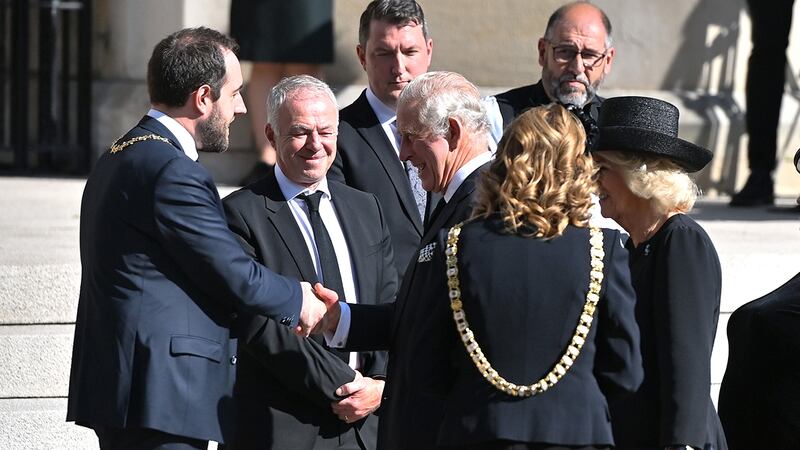 Photos: King Charles III visits Northern Ireland The Sheriff of Belfast, Councillor John Hussey greets King Charles III and Camilla, Queen Consort ahead of a service of reflection in memory of Queen Elizabeth II at St Anne's Cathedral on September 13, 2022 in Belfast, Northern Ireland. King Charles III is visiting Northern Ireland for the first time since ascending the throne following the death of his mother, Queen Elizabeth II, who died at Balmoral Castle on September 8, 2022. (Photo by Carrie Davenport/Getty Images) (Carrie Davenport/Getty Images)